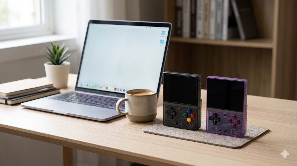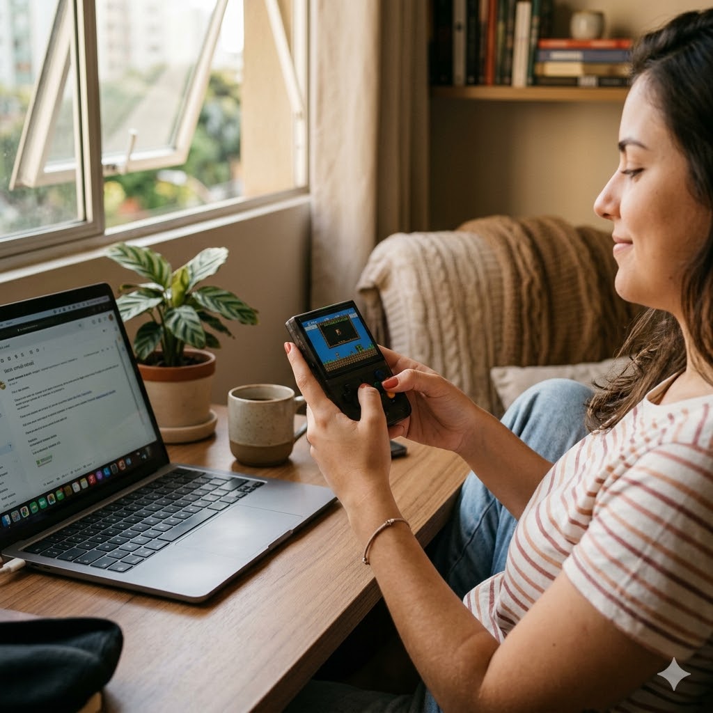 Ideal para quem vive no ritmo do home-office, esse console foi feito para trazer nostalgia, praticidade e entretenimento direto para suas mãos — seja no intervalo do trabalho, no sofá ou até na cama antes de dormir.